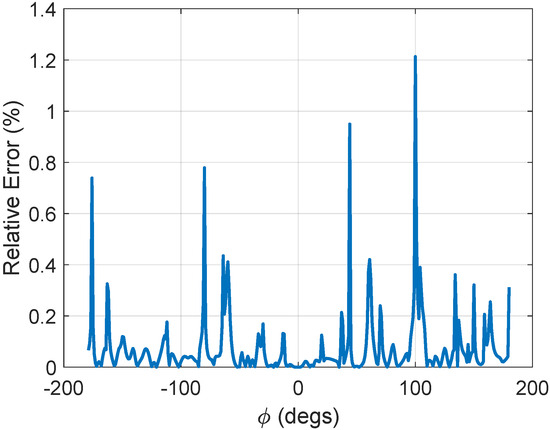 In order to further evaluate the accuracy of the estimation, the relative errors between the two algorithms are shown in Figure 9. The relative errors are all less than 1.4%, showing good accuracy of the proposed method. As a result, the jamming power evaluation could be simplified using the array-based algorithm.