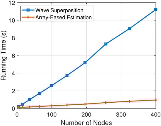 Under the same conditions, the running times of the two algorithms are compared. The results are shown in Figure 10. With the increase in the number of nodes, the calculation complexity of increases, so the running time of the waveform superposition algorithm increases significantly. In contrast, the running time of the array-based algorithm is maintained within 1 s, basically unaffected by the number of nodes, which can shorten the response time of the jammer and improve the response speed of electronic warfare in practical applications.