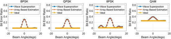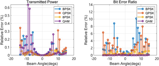 In order to verify the accuracy of the jamming power estimation, several experiments are conducted with different modulation types. Sixteen UAVs are located in a circle with a radius of 5 m, the jamming power of each UAV is 50 mW, and the transmitted power of each target is 1 W. The center of the UAVs is 1000 m far from the target, while the distance within the target is 200 m. Assume the jamming beam’s width is , and the target is within the beam. The bit error ratios (BERs) of different modulation types are shown in Figure 11. An improvement in BER indicates that the jamming impacts the signal quality, especially the complex modulation format, which shows a higher BER in different directions. In addition, the two jamming transmitted power estimation methods show good consistency, proving that the proposed method is applicable to different communication systems.