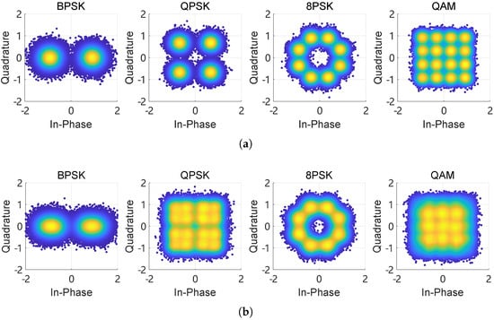 Furthermore, constellation diagrams are obtained from the demodulated signals. Figure 12a illustrates the constellation diagram of the target receiver under ideal conditions without jamming, where the signals are uniformly distributed across different quadrants, demonstrating high communication quality. However, as jamming is introduced, as shown in Figure 12b, it becomes challenging to recover the original signals as they overlap and cannot be effectively separated. This further validates the significant impact of jamming signals on the communication system.