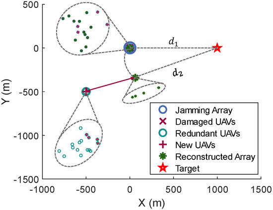 When UAVs conduct jamming, they are also susceptible to attacks. Therefore, it is essential to deploy redundant UAVs in the rear. This paper investigates scenarios where UAVs are attacked, the selection of new UAVs to join the jamming array, and the time required to restore jamming. It is assumed that there are also 16 redundant UAVs located 500 m from the jamming array. When the jamming array is attacked, the nearest redundant UAV is selected to join the array. The positions of the UAVs and the target are shown in the figure. When UAVs in the jamming array are attacked, the nearest redundant UAV is selected to reconstruct the jamming array. Notably, the new UAV does not need to fly to the position of the damaged UAV but instead chooses a location that is equidistant from the target as the damaged UAV. In Figure 14, distances and are the same, so the new UAV selects a closer position, thereby saving time.
