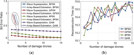 The relationship between the number of damaged UAVs and the bit error rate (BER) is simulated. As shown in Figure 15a, when the attack intensifies, the jamming effectiveness gradually decreases, and the trends for BPSK and QPSK are almost identical. Figure 15b illustrates the time required for jamming array reconstruction. Assuming a UAV flight speed of 30 m/s, the more UAVs that are reinforced, the more complex the mission decision-making and trajectory planning become, resulting in longer time consumption. In addition, the BER after the reconstruction is higher than that before the reconstruction. As shown in Table 1, the effective jamming is re-implemented after 4 UAVs are damaged, and the BER returns to normal.