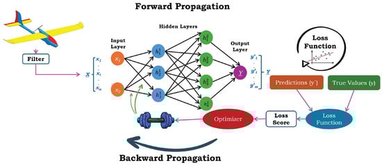 The neural network consists of an input layer with 49 features extracted from the UAV’s flight telemetry data. These features include sensor readings such as altitude, airspeed, accelerations, control surface positions, and target navigation waypoints, among others. The feature selection process was conducted to ensure that only the most relevant variables were retained, reducing computational complexity while maintaining predictive accuracy.