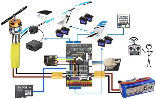 This study focuses on a case where the UAV is equipped with a minimal sensor suite, which makes it representative of a lower-bound scenario in terms of available flight data. In operational environments requiring higher levels of autonomy, such as defense or intelligence, surveillance, and reconnaissance (ISR) applications, UAVs may incorporate more advanced payloads, including LiDAR, thermal imaging, or multi-spectral cameras, which could further improve AI-driven navigation. Despite employing a relatively elementary UAV configuration, the study’s findings underscore the viability of reliable trajectory predictions, thereby substantiating the methodology’s adaptability. An illustrative representation of the interconnections within the UAV is provided in Figure 4.