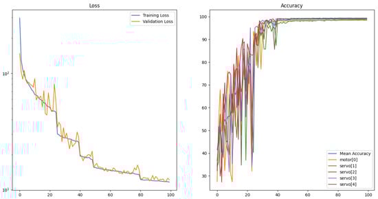 The output layer consists of four neurons, each corresponding to a control signal: elevator, aileron, yaw, and motor throttle. To facilitate convergence, the data from each layer are normalized and passed through a ReLU activation function, allowing the network to learn non-linear relationships between features. Additionally, a dropout rate of 0.1 was applied to prevent overfitting and improve the model’s generalization performance. The loss function employed is the MAE, optimized with the Adam optimizer initialized with a learning rate of 0.001. The data were processed in batches of 32 tensors.