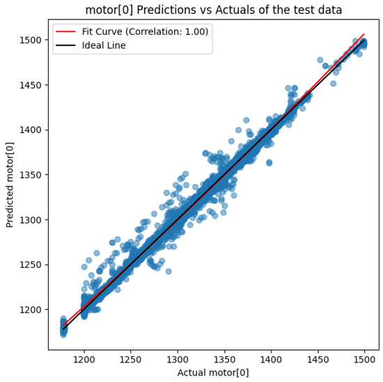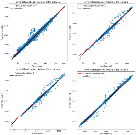 Figure 7 and Figure 8 display graphs illustrating the accuracy of the predictions. In these graphs, the actual measurement values are plotted on the x-axis, while the predicted values are plotted on the y-axis. The closer the points are to the diagonal and the less dispersed they are, the more accurate the predictions for each of the five parameters predicted using DL. It is important to note that the signal being analyzed is the one transmitted by the controller board to the electronic speed controllers and servomotors. The range of pulse width modulation (PWM) signals differs between the motor and the servomotors. For the servomotors (elevator, ailerons, and rudder), the signal typically ranges from 1000 μs to 2000 μs, where 1500 μs represents the neutral position. A value below 1500 μs moves the control surface in one direction, while a value above 1500 μs moves it in the opposite direction. For the motor (throttle control), the signal also operates within a range of 1000 μs to 2000 μs. However, in contrast to the servomotors, there is no neutral position at 1500 μs. Instead, 1000 μs corresponds to the motor being off, and increasing the signal above this value progressively increases the throttle output, reaching maximum power at 2000 μs.