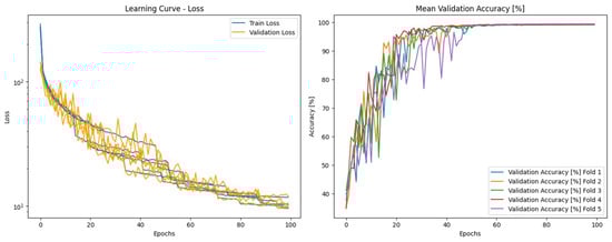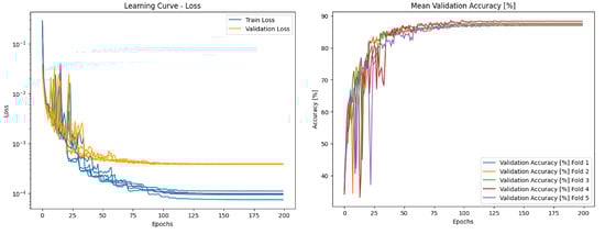 As shown in Figure 10, the mean validation accuracy curves indicate that the model reaches an accuracy level approaching 100% after approximately 40 epochs across all folds. This behavior suggests that the model has effectively learned the patterns present in the training data and can generalize these patterns to the validation data. The stabilization of the curves at high accuracy levels is a positive indicator of the model’s ability to make precise predictions. The consistent reduction in both the training and validation loss curves reflects continuous model improvement over the epochs. The simultaneous decrease in both curves indicates a good model fit, with no clear signs of overfitting. Fluctuations observed in the validation loss curves are expected due to the inherent variability of the validation data and do not significantly affect the overall downward trend. This behavior confirms that the model is learning effectively and minimizing prediction errors.
