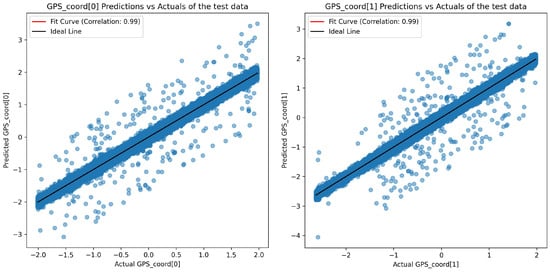 In Figure 11 (left), the results obtained from the GPS coordinate prediction model are presented. Figure 11 (right) shows that the training and validation loss values are notably low, approximately 10−4. This outcome is expected, as the loss function quantifies the discrepancy between predicted and actual values. Given that the differences in GPS coordinates are only a few thousandths of a decimal degree, the low loss values are not surprising.