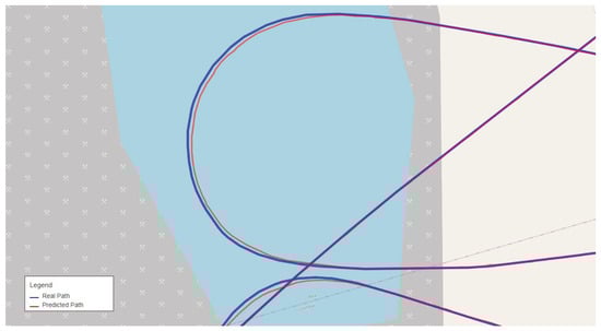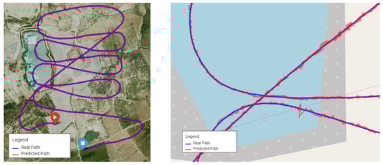 The implementation of this smoothing procedure has resulted in significantly more linear trajectories, as shown in Figure 15. The model’s training for the specified autonomous flights has been considered successful, allowing it to predict coordinates in emergency scenarios. As observed in the figure, the trajectory predicted by the model does not exactly match the actual path but is sufficiently accurate to enable automatic waypoint navigation without GPS in emergency situations.
