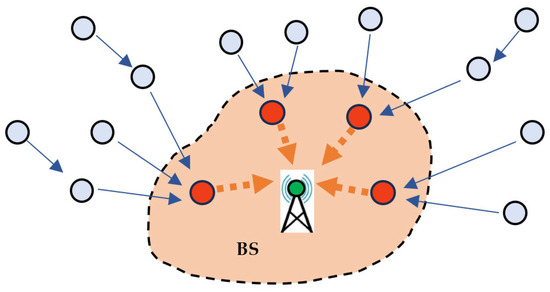 Another major issue in WSNs is the hotspot problem, where an energy imbalance occurs due to the increased energy consumption of nodes located in data hotspots. In WSNs, multi-hop communication is typically used, where distant sensor nodes pass data to the BS through intermediate nodes rather than transmitting directly. This causes sensors in proximity to the BS to transmit and receive several data to relay packets from farther sensors. As a result, the nodes located near the BS (red nodes) experience higher energy consumption and a shorter lifespan compared to other nodes, as shown in Figure 1. When hotspot nodes die, the BS no longer receives their data or the data they should relay, leading to network isolation [14].