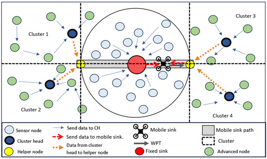 This paper introduces a new clustering scheme designed to partition the designated area into two distinct regions. The initial region is situated at the network’s center and is delineated by a circular area, housing a category of nodes referred to as standard nodes. The secondary region encompasses both sides of the circle and is further subdivided into four clusters, two on each side, comprising advanced nodes. In this proposed scheme, unmanned aerial vehicles (UAVs) function as mobile sinks, traversing the network to collect data from optimized clusters. Simultaneously, WPT is employed to wirelessly charge both fixed sink and helper nodes, with adaptive data collection rates based on available energy levels. This innovative approach mitigates the hotspot issue, leading to enhanced overall network connectivity and performance.