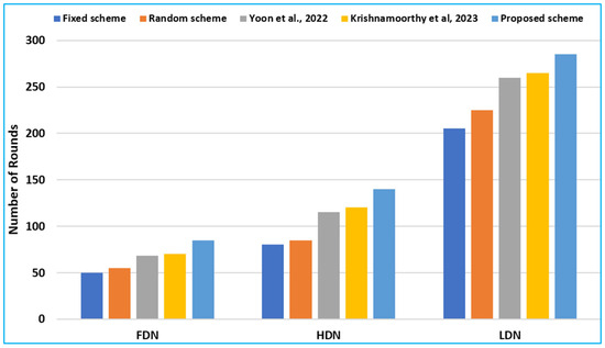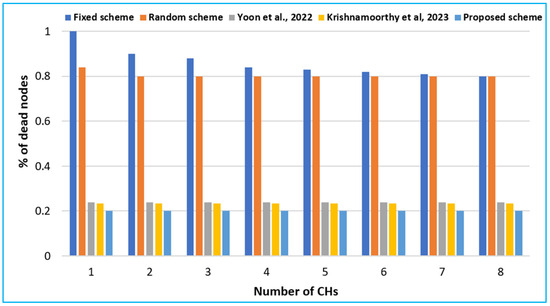 Figure 3 illustrates the relationship between the number of dead nodes and the number of cluster heads for the considered schemes. In this figure, the fixed and random clustering schemes maintain a predetermined number of clusters, whereas the proposed scheme, Yoon’s scheme [14], and Krishnamoorthy’s scheme [24] dynamically adjust the number of clusters based on the network’s energy conditions. Consequently, the proposed scheme and Yoon’s scheme [14] yielded identical outcomes in certain scenarios due to their energy-aware clustering mechanisms. However, Krishnamoorthy’s scheme [24], which employs energy-aware routing, also demonstrated improvements in reducing power outages compared to fixed and random clustering but did not perform as efficiently as our proposed scheme.