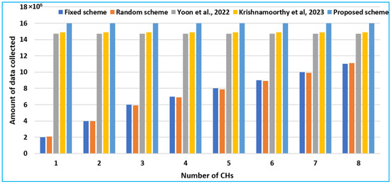 Figure 4 presents the data collection efficiency as a function of the number of cluster heads for the considered schemes. The results indicate that the proposed scheme achieves the highest data collection efficiency, benefiting from UAV-assisted data gathering and adaptive clustering which optimizes data transmission and minimizes packet loss. In contrast, the fixed and random clustering schemes exhibit lower efficiency due to inefficient cluster head selection and increased node failures, which disrupt communication and reduce the amount of successfully collected data. For example, when the number of CHs is four, the amount of data collection in the proposed scheme is 16 × 106 bit, whereas it decreases to 7 × 106 bit, 6.9 × 106 bit, 14.7 × 106 bit, and 14.9 × 106 bit for the fixed clustering, the random clustering, Yoon’s scheme [14], and Krishnamoorthy’s scheme [24], respectively.