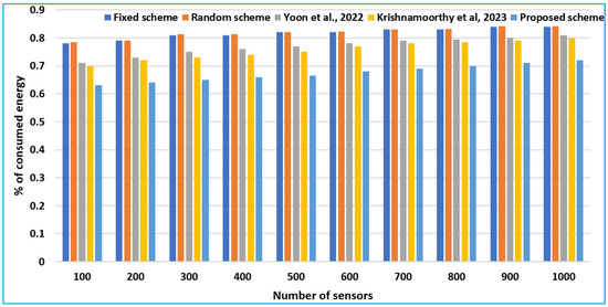 Figure 5 illustrates the proportion of energy consumption across all schemes. It is evident that the energy consumption increases as the number of nodes grows. However, the energy consumption of the proposed scheme is lower than that of the other schemes. This variation is primarily due to the smaller number of nodes experiencing blackouts in the proposed scheme. A reduced number of nodes experiencing blackouts mean that the nodes within hotspots must expend more energy since they need to relay data from other nodes. Additionally, the helper nodes consume more energy as they receive energy from the mobile sink and utilize it. Consequently, the proposed scheme exhibits lower energy consumption in contrast to the other schemes. For example, when the number of sensors is 400, the percentage of consumed energy in the proposed scheme is 66%, whereas it increases to 81%, 81.3%, 76%, and 74% for the fixed clustering, the random clustering, Yoon’s scheme [14], and Krishnamoorthy’s scheme [24], respectively.