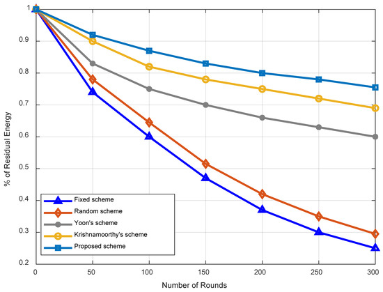 Figure 6 presents the residual energy levels of sensor nodes across different simulation rounds for the five considered schemes: the proposed scheme, the fixed clustering, the random clustering, Yoon’s scheme [14], and Krishnamoorthy’s scheme [24]. The results demonstrate that the proposed scheme maintains the highest residual energy, outperforming all other approaches. Specifically, at the end of the simulation (round 300), the proposed scheme retains approximately 75.5% of residual energy, whereas Yoon’s scheme [14] and Krishnamoorthy’s scheme [24] retain 60% and 69%, respectively. In contrast, fixed clustering and random clustering exhibit a steeper decline, with only 25% and 29.5% remaining, respectively. This improvement is attributed to the proposed cluster formation and UAV-assisted WPT, which optimizes energy distribution and prevents the rapid depletion of nodes. Moreover, the proposed scheme minimizes transmission hops and optimizes the UAV’s path, reducing energy consumption and achieving the highest residual energy level among the considered schemes.