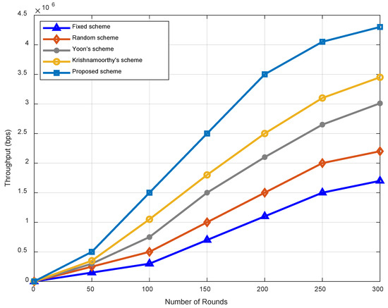 Figure 8 illustrates the throughput performance, measured as the total amount of successfully transmitted data across the five considered schemes. The results show that the proposed scheme achieves the highest throughput, ensuring more efficient and reliable data collection. Specifically, at the end of the simulation (round 300), the proposed scheme achieves approximately 4.3 Mbps, whereas Yoon’s scheme [14] and Krishnamoorthy’s scheme [24] attain 3.01 Mbps and 3.45 Mbps, respectively. In contrast, fixed clustering and random clustering demonstrate significantly lower throughput, with only 1.7 Mbps and 2.2 Mbps, respectively. The higher throughput in the proposed scheme is attributed to the adaptive clustering mechanism and UAV-assisted data gathering, which prevent network congestion and optimize data transmission efficiency. By reducing transmission hops and minimizing the communication overhead, the proposed scheme ensures higher data delivery efficiency, making it a more robust solution for real-time and energy-efficient WSN-based smart irrigation systems.