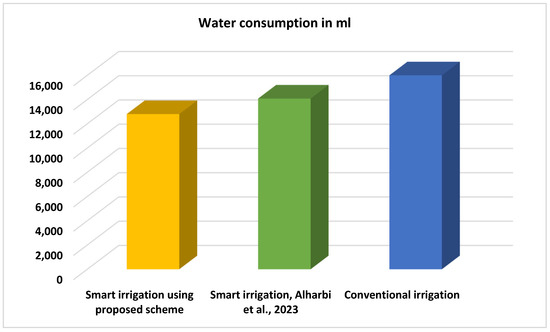 Figure 10 illustrates a one-day contrast in water consumption between conventional irrigation, the smart irrigation method in [32], and smart irrigation using the proposed scheme. In this analysis, and according to Figure 6 in [32], the farmer opens the valve at the beginning of the day for one hour in the conventional irrigation method. Assuming a pump with a rate of 16,000 mL per hour, the conventional irrigation method requires 16,000 mL per day for irrigation. On the other side, based on the results presented in [32,33,34], the smart irrigation method operates four times a day, with irrigation durations varying depending on the applied scheme, as shown in Table 3 [34]. The irrigation times listed in Table 3 were determined using SAS 9.4M8 software [35], which calculates the optimal irrigation duration for each method. This duration represents the time interval between the activation and deactivation of the electric valve based on sensor readings.