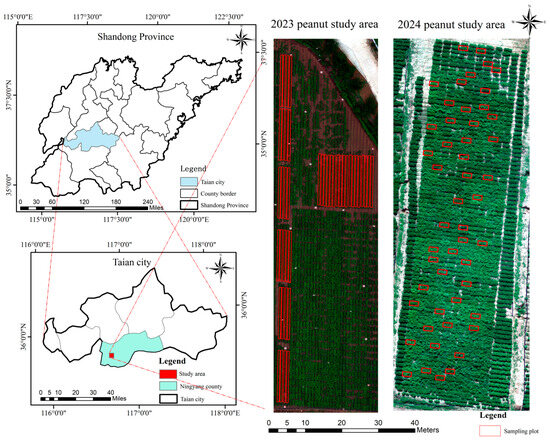The study was conducted during 2023–2024 growing seasons at the Ningyang Experimental Station (35°50′57″ N, 116°39′50″ E) of Shandong Academy of Agricultural Sciences, China (Figure 1). Situated in a warm-temperate semi-humid monsoon climate zone, the site exhibited characteristic seasonal precipitation patterns with 72% rainfall concentrated in July-August (605.1 mm in 2023; 849.3 mm in 2024), accompanied by average annual temperatures of 14.0 °C and 13.4 °C for respective years. The experimental fields featured well-drained sandy loam soils (Haplic Cambisols, FAO classification) with 1.2% organic matter content, characteristic of high-yield peanut cultivation regions in the Yellow River Valley.