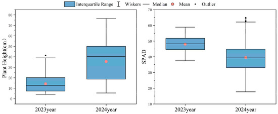 At each critical growth stage, five representative plants were systematically sampled following standardized phenotyping protocols. Field-measured plant height (cm) and SPAD-502 m (Konica Minolta, Chiyoda-ku, Tokyo 100-7015, Japan) readings were recorded between 10:00 and 14:00 local time under diffuse light conditions. Statistical analysis revealed interannual variability patterns (Figure 2), with 2024 SPAD measurements exhibiting greater dispersion. This increased heterogeneity in the 2024 dataset justified its selection for model calibration, while the 2023 data served as an independent validation set.