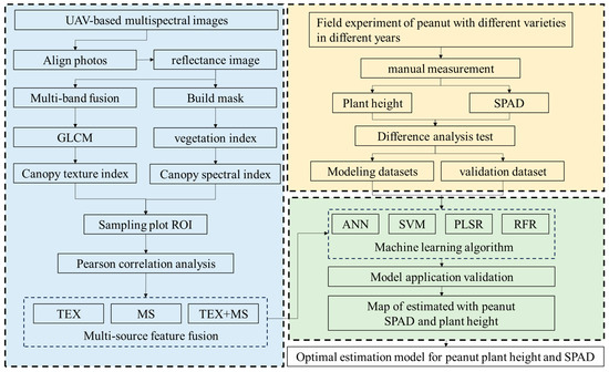 The specificity of peanut plants has limited the use of this high-throughput phenotypic detection and analysis method, and little is known about the contribution of combining canopy spectral and textural features to peanut phenotypic estimation. In conclusion, regression models based on data fusion of UAV-mounted multi-type sensors while using machine learning have been used for crop trait estimation. To detect crop growth and development using phenotypic data, this study proposes to analyze and research multi-source data fusion of peanut phenotypic metrics using a UAV equipped with multispectral lenses. Additionally, the following concerns are recommended to be investigated: 1. The viability of estimating peanut phenotypic metrics using multi-source data fusion techniques; 2. The impact of various data sources on the model’s estimation accuracy; 3. A comparison of the RFR and PLSR, SVM, and ANN differences among the four approaches for estimating peanut phenotypes; 4. Verify that the peanut phenotypic prediction model is applicable and generalizable.