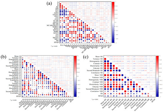 Demonstrates correlation analyses between peanut phenotypic parameters (plant height and SPAD values) and remote sensing-derived features. Panels (a–c), respectively, present (a) spectral feature correlations, (b) visible-band textural feature associations, and (c) near-infrared-band texture characteristic relationships.