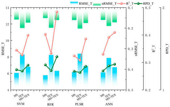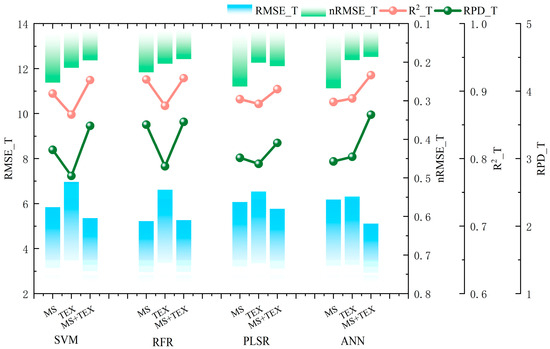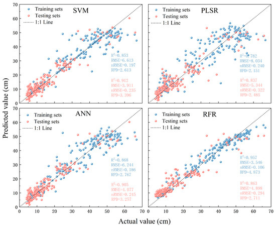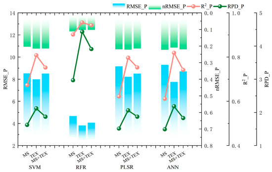 Machine learning model evaluation demonstrated significant performance variations when using TEX for plant height prediction (Figure 5). Among the four algorithms evaluated, RFR achieved superior training accuracy (R2 = 95.6%) compared to SVM (R2 = 80.8%), PLSR (R2 = 79.7%), and ANN (R2 = 81.9%). Comparative analysis revealed that RFR showed a 14.7~15.9% improvement in R2 and 2.24~2.36 enhancement in RPD relative to other models when utilizing TEX inputs. Notably, all models exhibited R2 values exceeding 79% with TEX, indicating their universal enhancement effect on prediction accuracy. This pattern suggests TEX parameters substantially improve model performance, particularly through their synergistic interaction with ensemble learning methods like RFR.