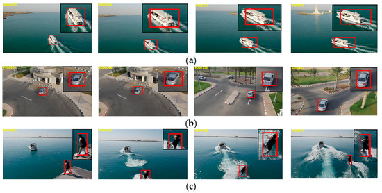 To verify the robustness of SDBCF in complex scenes, four trackers (SRDCF, Auto Track, EFSCF, and SOCF) were selected and there performance when using five challenging video sequences was compared. Figure 5 shows the tracking results of the five trackers, with smaller-resolution targets appropriately enlarged and cropped and displayed in the upper right or lower left corner of the corresponding image.