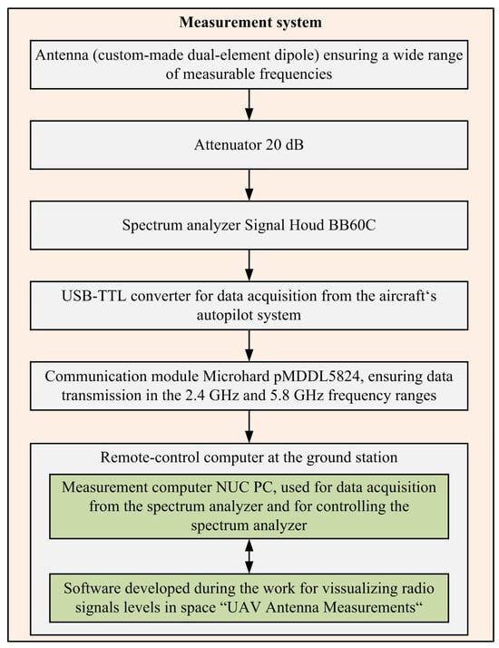 Regarding the mentioned tasks and the general measurement diagram in Figure 1, radio frequencies recorded by the spectrum analyzer were transmitted to the onboard measurement computer, which also controlled the spectrum analyzer via a USB connection. Measurement data and control signals were transmitted from the aircraft via onboard dedicated communication equipment to the ground station, where they were displayed on a remote-control computer (ground station). The total weight of the measurement system when assembled was in the range of 2 kg.