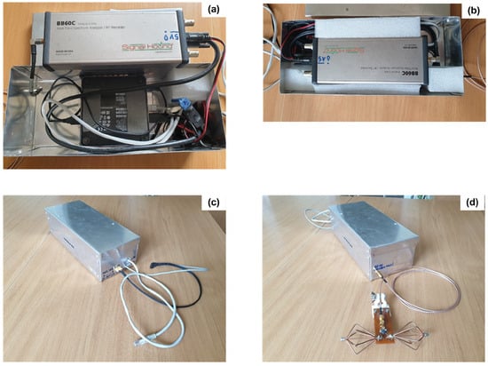 During the measurements, a real-time spectrum analyzer, BB60C, connected to a Raspberry Pi Foundation developed Raspberry Pi embedded computer was used. The embedded computer was connected to a digital data transmission system, allowing remote monitoring and control of the measurements. Specialized spectrum analyzer software was developed, to collect and transmit data to a ground station separate from the UAV control, as shown in Figure 7a.