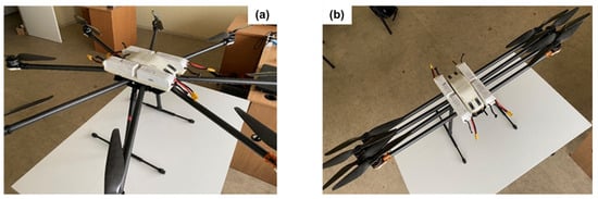 During the investigation and development, a few versions of the multi-rotor drones (Figure 3a) and a fixed-wing UAV were developed, as shown in Figure 3b, for conducting measurements, carrying the same equipment as the aforementioned experimental one.