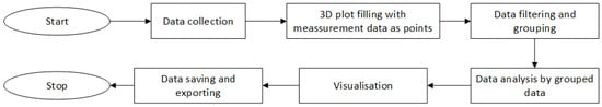 Since the measurement data were recorded at each measurement moment (approximately every 1 s) in different spatial positions, due to the flight characteristics of the UAVs, a new data processing and visualization algorithm had to be developed (see Figure 9):