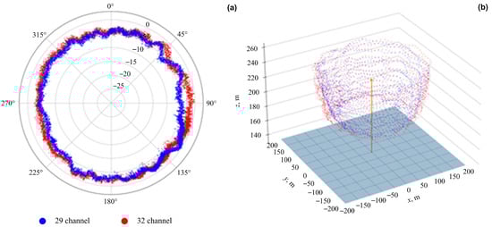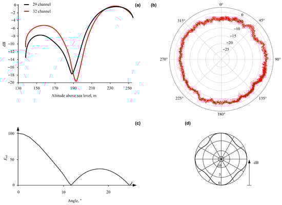 When conducting repeated measurements, the maximum discrepancy in the results was up to 1 dB. This indicates that the results could vary by as much as 1 dB between different measurements. In all cases, the results of the practical measurements differed significantly from the theoretically presented antenna gain data. This is interesting, because the measurements where performed in a clean environment, and no obvious physical obstruction, weather condition, multipath, or electromagnetic or frequency interference was observed at the UAV’s flight altitude. Two-dimensional channel 29 and channel 32 H diagrams at a distance of 200 m from the tower, 235 m height are presented in Figure 17a. Three-dimensional 29 channel 29 and channel 32 H diagrams at a distance of 330 m from the tower (airplane, radii from 190 m to 250 m, step 5 m) are presented in Figure 17b: