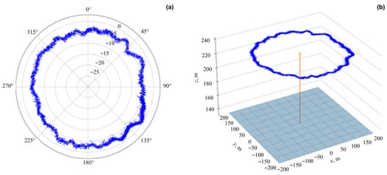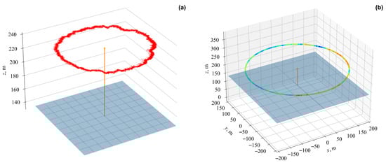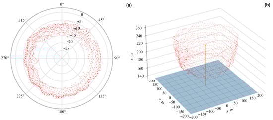 - After determining the antenna’s radiation maximum along the vertical axis, the second flight involves measuring the antenna’s radiation on the horizontal plane (Figure A1b). In this stage, the aircraft flies in a circle at the determined altitude and radius (typically 200 m) around the antenna being measured, collecting radiation strength data. The flight speed is usually limited by the aircraft’s capabilities and weather conditions, typically ranging from 5 to 7 m/s.