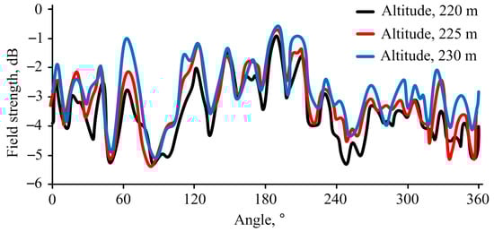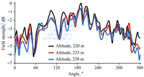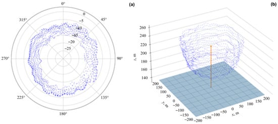 Typically, during the measurement, the altitude of the flight circle is changed every 5 m (other altitude change steps are also possible). In all flight stages, antenna radiation measurements are conducted. In this way, due to measurements at different altitudes, a 3D antenna measurement diagram is obtained (Figure A2b).