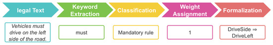 To illustrate the transformation process from legal text to system-processable parameters, we provide a structured framework depicted in Figure 1. This workflow begins with raw legal provisions (e.g., traffic regulations from the UK, France, and Japan), where keyword extraction identifies critical terms such as ‘must’, ‘should not’, or ‘recommended’. These terms are then classified into predefined legal strength categories (e.g., Mandatory, Requisite) through classification, aligning with the hierarchical weight ranges defined in Section 3.1. Subsequently, weight assignment assigns numerical values (e.g., 1 for Mandatory rules) to reflect enforceability levels. Finally, the classified rules are formalized into logical expressions (e.g., ) compatible with the system’s reasoning engine. This structured approach ensures transparency and reproducibility in handling cross-jurisdictional conflicts, enabling designers to trace how legal norms influence quantitative evaluations. The color-coded stages in Figure 1 further clarify each step’s role, emphasizing the systematic transition from textual ambiguity to computational precision.