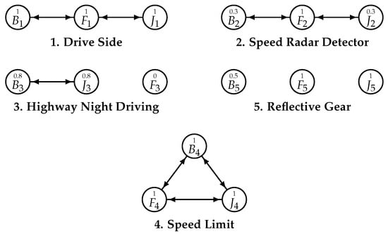 Beyond the abovementioned points, based on the results in Table 5, we can also observe that when we pay more attention to the strongest attacker, the argument with the highest acceptability (excluding arguments in the fifth scenario that do not conflict with any other arguments; these will be assumed excluded in subsequent discussions) is from the second scenario, which is constructed based on French regulations. Meanwhile, the arguments with the highest rejectability are and from the same scenario, which are based on regulations from the UK and Japan. This indicates that arguments with a higher basic (or initial) weight and weaker attackers have the greatest advantage. That is, when the design obtained from a highly mandatory regulation conflicts with the design obtained from a less mandatory regulation, the former has more advantages. Such an observation can help users identify the most dominant designs from a legal compliance perspective. For manufacturers of autonomous vehicles, this insight highlights the most challenging design modifications; on the one hand, designs with higher non-compliance costs and legal reasons are pointed out; on the other hand, more extensive modifications are required.