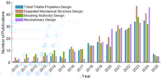 The annual publication trends in this field, as well as the four subcategories identified, are illustrated in Figure 1. It is evident that the number of research publications on unconventional rotary-wing UAVs has increased steadily, from fewer than 20 in 2010 to over 150 in recent years. This trend can be attributed to the matured understanding of the dynamics and controls of conventional rotary-wing UAVs [10], prompting researchers to focus on designing unconventional UAVs for specific applications.