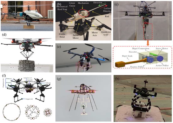 The integration of additional mechanical components into conventional multirotor platforms represents an intuitive and effective approach for expanding drones’ capabilities. This method is favored due to its structural simplicity and ease of scalability, leveraging existing multirotor control frameworks. Current expanded mechanical structures typically include robotic arms and grippers, perching mechanisms, wheels or walking mechanisms, and anti-interference systems. These innovations demonstrate significant potential for enhancing drone–environment interactions, adapting to diverse operational states, and improving flight stability.