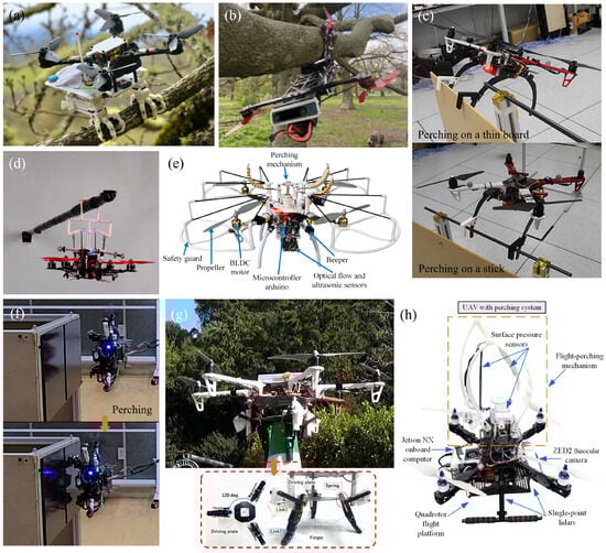Hang et al. proposed a modular, actuated landing gear framework enabling UAVs to perch and rest on diverse structures, reducing power consumption, enhancing stability, and preserving mission continuity without complex maneuvering [47]. Roderick et al. developed a biomimetic robot with passive legs and an underactuated gripper for dynamic perching on complex surfaces [48]. The system was validated through experiments, demonstrating that avian toe arrangements minimally impact perching performance. Bai et al. presented a bioinspired UAV perching system mimicking bird feet, featuring elastic toes and gear-driven reconfiguration for multi-object perching, achieving 15× payload capacity and 98.5% energy reduction [49]. Additionally, some gripper designs are multifunctional, enabling tasks such as grasping and perching [41]. The same group further advanced this concept with a bat-inspired mechanism using ratchet/four-link self-locking and autonomous target tracking via sensor fusion, achieving 97.1% energy savings and reliable outdoor perching on unstructured surfaces like branches and crossbars [50]. Zheng et al. designed metamorphic bi-stable arms for rapid morphing and perching [51]. Kominami et al. proposed a passively driven perching mechanism with underactuated fingers and two passive drive modes for landing on flat surfaces and grasping various objects (e.g., bars, plates, spheres), achieving lightweight, actuator-free operation and validating gripping forces through theoretical and experimental analysis [52]. Additionally, a simple design utilizing magnets for perching and unperching on ferromagnetic surfaces has been demonstrated as a feasible approach [53]. Some representative examples of perching mechanisms are shown in Figure 5.