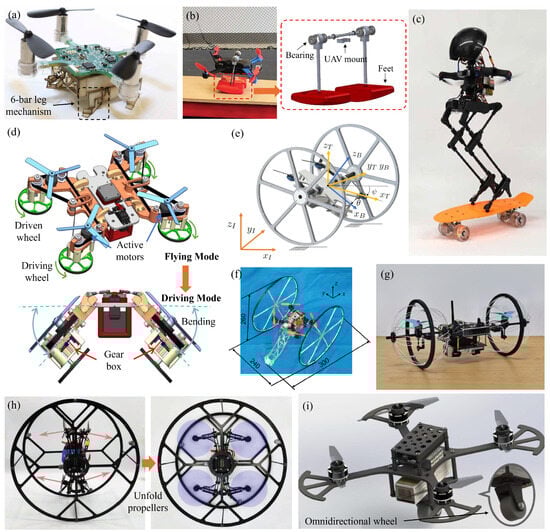 Examples of locomotion mechanisms. A. Walking mechanism: (a) Flying Monkey [54], (b) DUCK robot [55], (c) LEONARDO [56]. B. Wheeling mechanism: (d) FSTAR with reconfigurable and active wheels [57], (e) TABV with passive planar wheels [59], (f) a quadrotor with two active wheels [58], (g) SytaB with passive spherical wheels [60], (h) Quadrolltor with a passive rolling cylindrical wheel (left: folded propellers; right: unfolded propellers) [61], (i) Skywalker with a passive omnidirectional wheel [62].