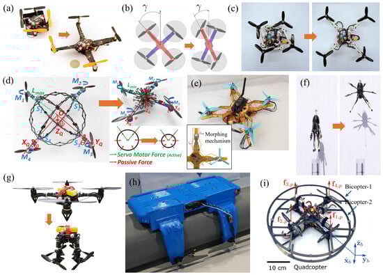 - Xing, S.; Zhang, X.; Tian, J.; Xie, C.; Chen, Z.; Sun, J. Morphing Quadrotors: Enhancing Versatility and Adaptability in Drone Applications—A Review. Drones 2024, 8, 762. [Google Scholar] [CrossRef]