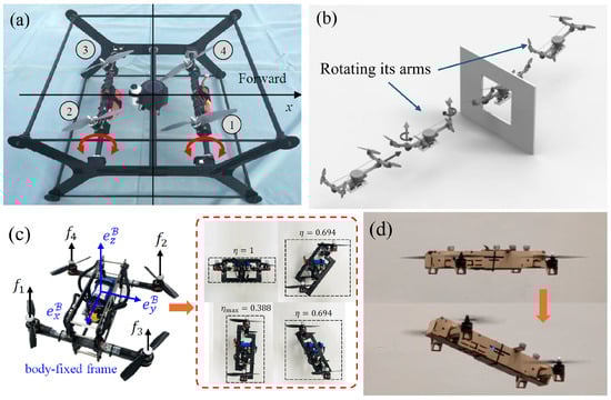 The Bi2 Copter, a robot with a novel morphing design that connects two bicopter modules, enables continuous 360° tilt angle adjustment and efficient thrust utilization for applications like wall flying and spherical coverage. Its design, control, and operational performance were validated through comprehensive testing [78]. Riviere et al. presented a Quad-Morphing robot with an actuated elastic mechanism, enabling it to fold its wingspan by half to pass through narrow gaps at high speeds while maintaining stability through a specialized control strategy and recovery procedure [79]. Sakaguchi et al. designed a novel quadcopter with a parallel link mechanism and a single servo motor, enabling tilt angle adjustment and vertical folding within user-specified ranges [80]. A stabilization strategy for extreme tilt angles around was proposed, utilizing a reference tilt angle generator. Tang et al. [81] proposed a quadcopter with a non-driven rotor tilt mechanism (QUaRTM), which is not categorized under Section 3. Unlike with the active adjustable arms by Ding et al. [29], passive hinges are used to replace the rigid arm–body connection, allowing propeller tilt in the forward flight direction without central body movement. Springs at the hinges pull the arms into an untilted configuration: when net propeller thrust overcomes spring torque, the vehicle tilts; when thrust falls below the threshold, the arms return, restoring the untilted configuration. Some representative examples of rotatable-frame morphing designs are shown in Figure 8.