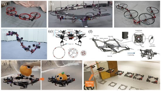 Shi et al. designed a transformable multilink aerial robot to achieve aerial regrasping, such as pivoting a long box [85]. This was accomplished by optimizing joint configurations, grasping forces, and employing impedance and admittance controllers to mitigate external disturbances and downwash effects. Zhao et al. presented a quadrotor with an articulated rigid-element morphing mechanism that enables in-flight shape adjustment and dual-function grasping of diverse objects, validated through experiments demonstrating minimal flight disruption and effective adaptability [40]. Wu et al. invented Ring-Rotor, a ring-shaped quadrotor with a single-servo morphing mechanism reducing its dimensions by 31.4%, enabling energy-efficient flight, traversal of narrow spaces, and whole-body aerial grasping of various objects without external manipulators [77]. This design was validated through prototype experiments using a nonlinear model predictive control strategy. Xu et al. designed a biomimetic morphing quadrotor with vertically folding arms inspired by an eagle claw, enabling the dynamic grasping of unknown objects and traversal of narrow spaces using a closed-loop multilink structure, adaptive sliding mode control, and admittance filtering for adaptive morphology [76]. Some representative examples of linkage-morphing designs are shown in Figure 9.