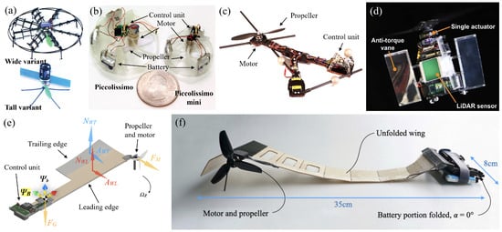 Examples of single-actuator designs: (a) A single actuator micro-aerial vehicle [87]. (b) Piccolissimo [88]. (c) Monospinner [89]. (d) PULSAR [92]. (e) SAM [90]. (f) F-SAM [91].