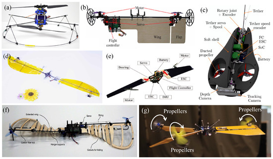 Examples of dual/triple-actuator designs: (a) A swashplateless micro-air vehicle [93,94]. (b) A single-wing rotorcraft [96]. (c) AVOCADO [99]. (d) Bioinspired revolving-wing drone [98]. (e) THOR [101,102]. (f) FROW [97]. (g) ARROWs [105,106].