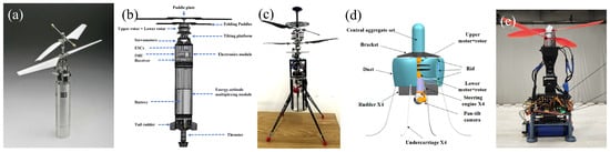 Examples of coaxial designs: (a) GLMAV [108]. (b) TDAV [109]. (c) CRA [110]. (d) A ducted coaxial-rotor UAV [111]. (e) A coaxial drone by Chen et al. [112].
