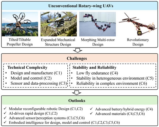 In recent decades, significant advancements have been achieved in rotary-wing unmanned aerial vehicles (UAVs) for industrial, agricultural, and recreational applications. Though fixed-wing or flapping-wing drones and vertical takeoff and landing (VTOL) drones have demonstrated their unique advantages, rotary-wing UAVs, such as quadcopters, have gained more attention and been widely adopted due to their compact sizes, vertical takeoff capabilities, stable hovering performance, and operational simplicity [1]. Lift and control moments are generated through horizontally rotating rotors, with their design principles and flight dynamics having been extensively studied and optimized [2]. However, as technological progress continues and application requirements evolve, increasing attention has been directed toward unconventional rotary-wing UAVs [3]. These designs aim to overcome the limitations of traditional systems by modifying rotor layouts, optimizing airframe structures, or employing unique flight mechanisms to enhance performance, adaptability, and functionality. More specifically, these designs significantly differ from traditional designs in the following aspects: