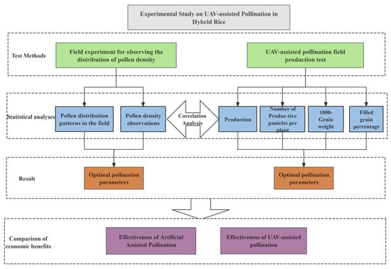 The rapid advancement of unmanned aerial vehicle (UAV) technology has expanded its agricultural applications across diverse domains [10,11,12,13,14,15,16,17,18], including precision field mapping [19], pest-disease surveillance [4], disaster assessment [20], targeted seeding [21], and notably, crop pollination [22]. Successful implementations of UAV-assisted pollination have been documented in crops such as tomatoes [23], jujubes [24], bitter melons [25], and oilseed species [26], with preliminary explorations in hybrid rice systems. Pioneering work by Wang Pei [27] developed a UAV-mounted wireless sensor network to measure wind dynamics within rice canopies. Building on this, Li Jiyu [28] identified that wind velocity components parallel (X-axis) and perpendicular (Y-axis) to UAV flight paths critically influence pollen dispersion. Complementary research by Wang [29] integrated wind field characterization with high-speed imaging, establishing predictive models linking UAV flight speed to pollen distribution through wind tunnel and field experiments. Despite these advancements, systematic evaluations of how UAV operational parameters affect pollination efficacy, cost-efficiency, and economic returns remain scarce. To address this gap, this study employs a DJI T50 multi-rotor UAV to optimize pollination protocols and operational parameters, aiming to advance both theoretical frameworks and practical implementations of UAV-based hybrid rice pollination.