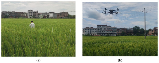 To ensure the accuracy of the experimental data, the field used in the experiment was required to be not less than 667 m2. In each experimental field, three sampling areas were set up, with at least two rows of parent plants spaced within each sampling area to avoid overlapping of the collected pollen. A slide coated with vaseline was fixed onto a 1.5 m long sampling rod using a universal clamp, allowing pollen to be captured through the vaseline. The density of pollen distribution was indicated by the amount of pollen settling on the slide. The position of the gimbal clamp was adjusted according to the height of the rice spike layer to ensure that the sampling point was as close as possible to the height of the maternal spike layer, as shown in Figure 2. Field pollen sampling is shown in Figure 3.