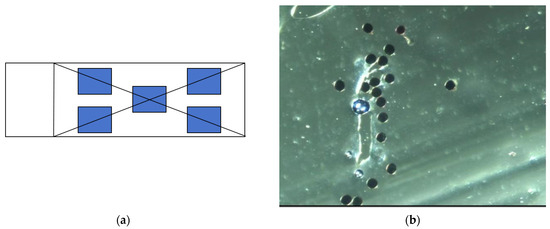 Immediately after the pollination test, the slides from the sampling points in the sampling area were collected. Five observation points were evenly selected on each slide in a plum blossom shape, the sampling method is shown in Figure 4. These observation points were stained with 2% iodide-potassium iodide solution. The stained slides were then placed under an electronic eyepiece with a 4× objective microscope for observation. By moving the slides, the distribution of pollen was observed under different observation points. Random observations were made at each point, and the number of pollen particles was counted in three fields of view per observation point, resulting in a total of 15 effective fields of view. The average number of pollen particles in these 15 fields of view was calculated as the pollen distribution on a single slide [23].